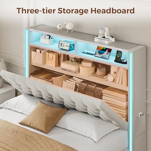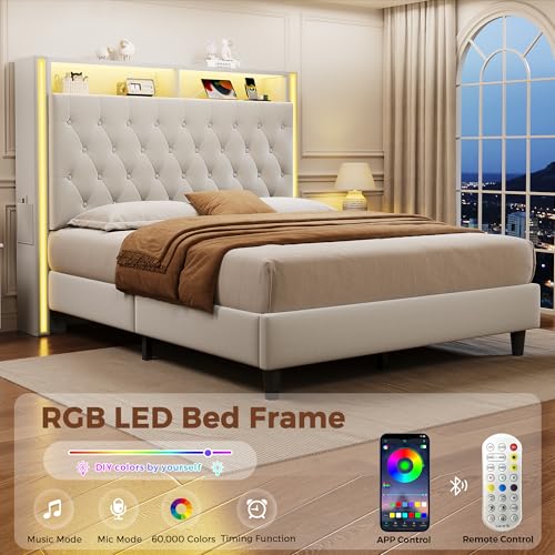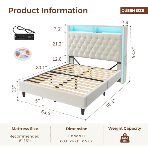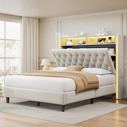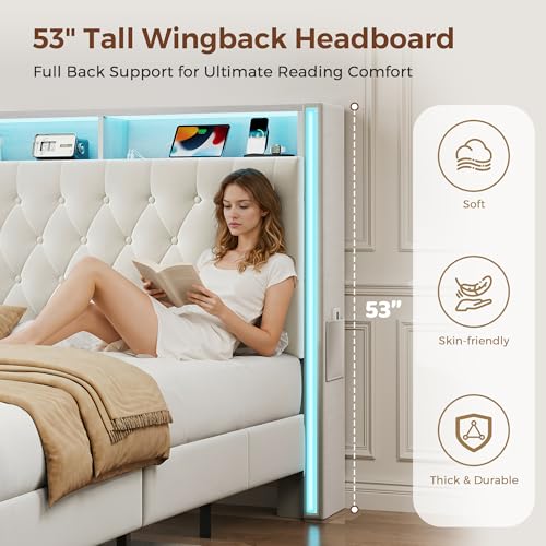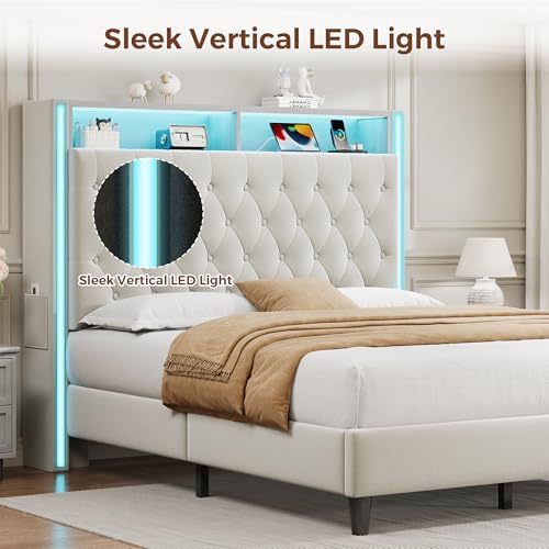 Specification: Queen Bed Frame with Tall Headboard, 53″ Velvet Upholstered Bed Queen Size with 3-Tier Storage Headboard and Sleek Vertical LED Light, Charging Station, Sturdy & Easy to Assemble, Cream White