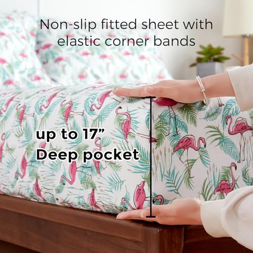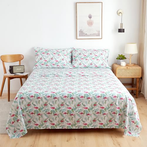 Queen Sheet Set, 4 Piece Bed Sheets for Queen Size Micro Boho Printed Bed Set, 17 Inch Sheets Deep Pocket, Soft and Breathable Microfiber, Wrinkle Free, Flamingo Plants Patterned Double Bedding
