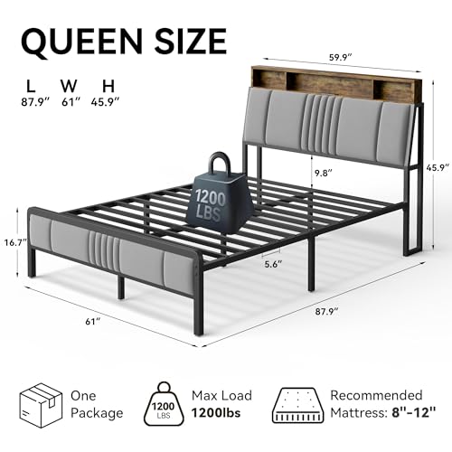 Specification: Queen Size Bed Frame with Storage Headboard and Charging Station, Ergonomic Platform Bed Frame with LED Lights, Strong Metal Slat Support, No Box Spring Needed, Noise Free, Grey
