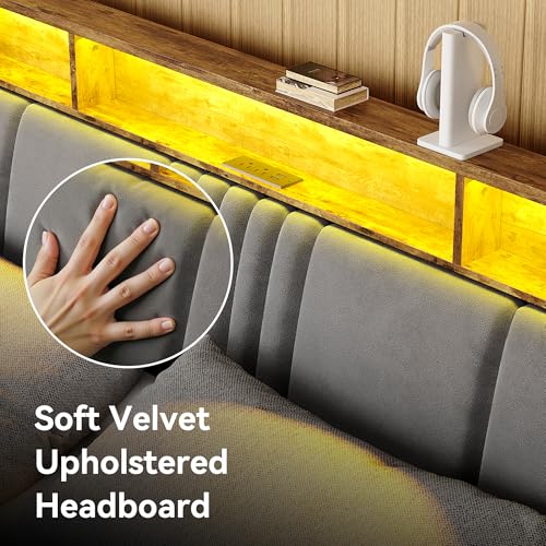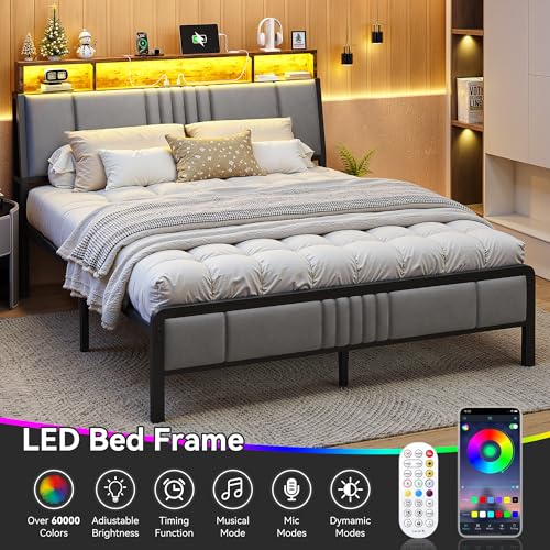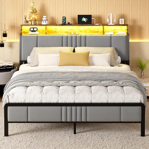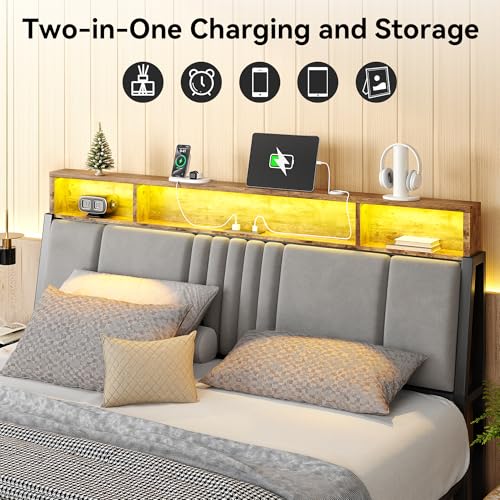 Queen Size Bed Frame with Storage Headboard and Charging Station, Ergonomic Platform Bed Frame with LED Lights, Strong Metal Slat Support, No Box Spring Needed, Noise Free, Grey