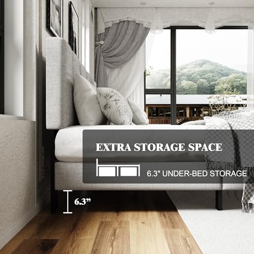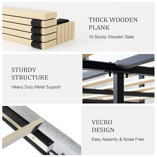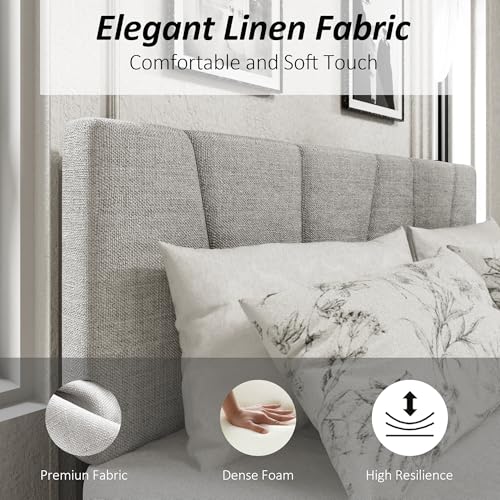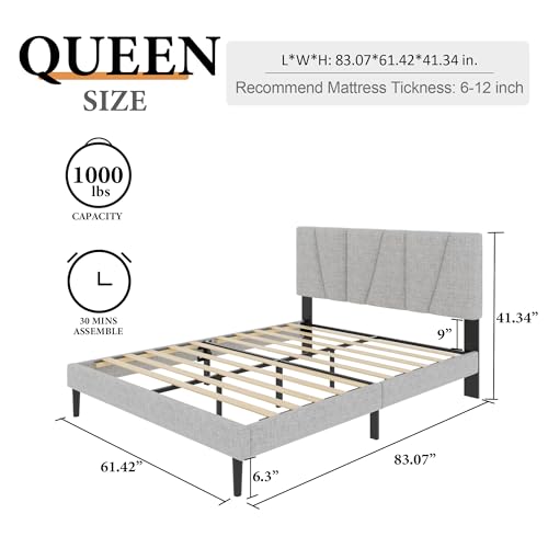 Specification: Queen Size Platform Bed Frame with Upholstered Headboard, Wooden Slats Support, Noise Free, No Box Spring Needed, Easy Assembly, Light Grey, Linen