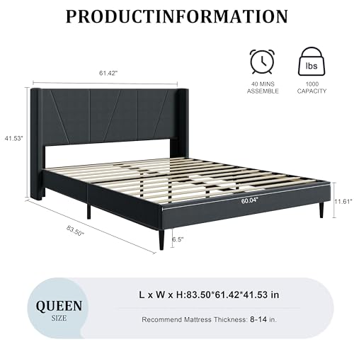 Specification: Queen Size Upholstered Platform Bed, Queen Frame with Tufted Headboard, Sturdy Frame Wooden Slats, No Spring Mattress Required, Noiseless, Easy to Assemble, Dark Gray