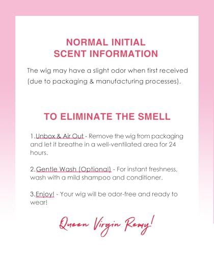 Note: Your newly unboxed wig may have a slight odor from the manufacturing process. This is completely normal. To eliminate it, simply place the wig in a shaded, well-ventilated area for a short while. Please avoid direct sunlight.