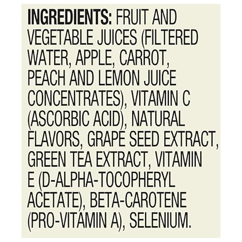 Apple, carrot, peach, and lemon ingredients combined with grape seed extract, green tea extract and other ingredients for a beverage with a punch
