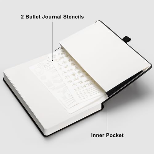 BULLET DOTTED JOURNAL: RETTACY Bullet Dotted Journal comes in A5 (5.7” × 8.3”) size, 256 Pages, durable and smooth Leather Hardcover, 120 GSM Acid-free Paper, Inner Pocket, Bullet Journaling Stencils, 2 Ribbon Bookmarks & Elastic Closure Band