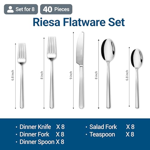 Riesa Flatware Set for 8, 40-Piece Silverware Set, 18/10 Stainless Steel Cutlery with Mirror Finish, Dishwasher Safe Utensils for Home, Kitchen, Everyday Dining and Entertaining
