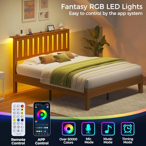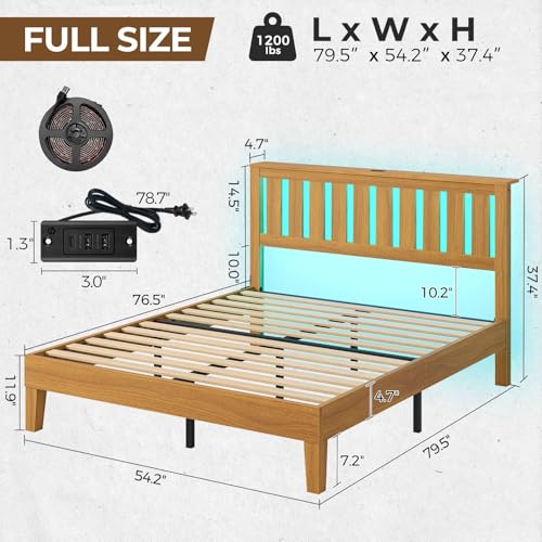 Specification: Rolanstar Full Bed Frame with Headboard, Charging Station and LED Lights, Wooden Bed Frame Foundation with Wood Slat Support, No Box Spring Needed, Pine