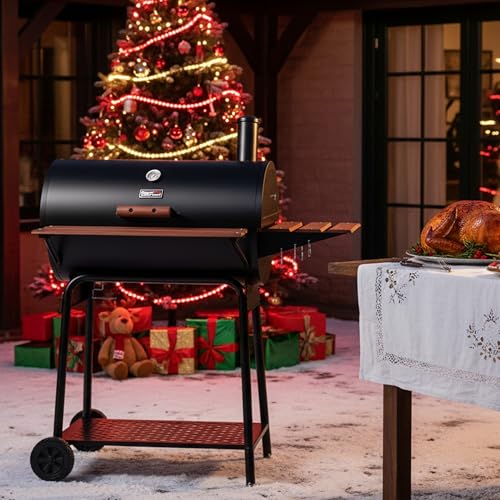 Specification: Royal Gourmet CC1830V 30 Barrel Charcoal Grill with Wood-Painted Side Front Table, 627 Square Inches Cooking Space, for Outdoor Backyard, Patio and Parties, Black