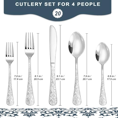 Specification: Runfly Vintage Carved Stainless Steel 20 Pieces Flatware Set, Silverware Set, Modern Embossed Cutlery Set Utensils Including Fork Spoon and Knife