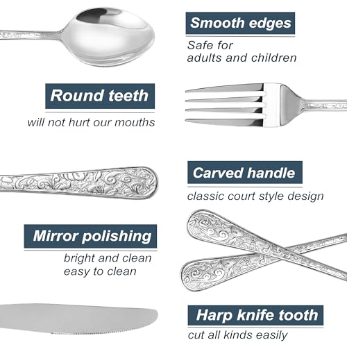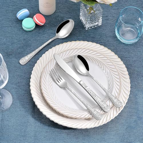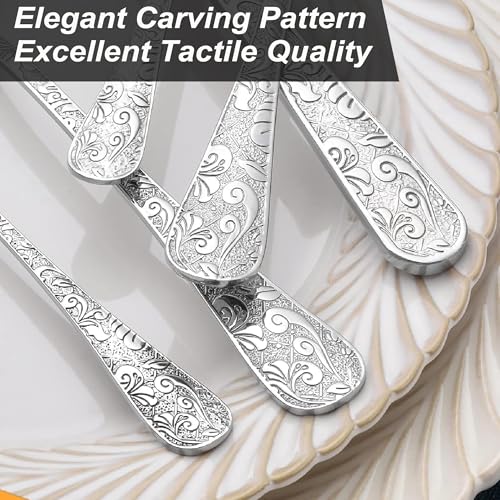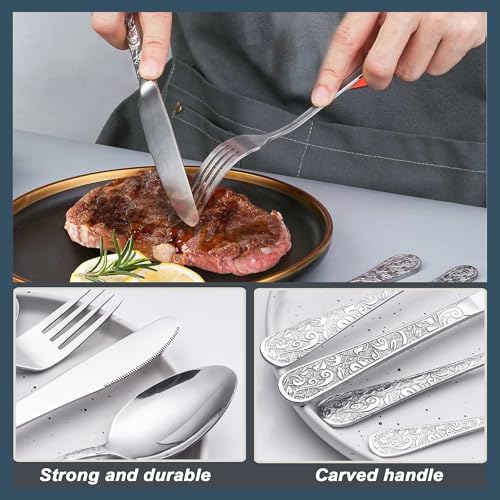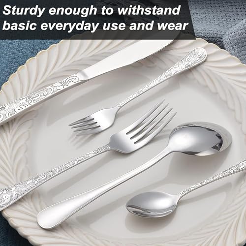 Unique & Elegant :This flatware sets features exquisite floral laser-etched patterns, an elegant appearance, and smooth-designed handles. A comfortable hand-holding curve enhances your dining experience while adding beauty to your home and kitchen dining room.