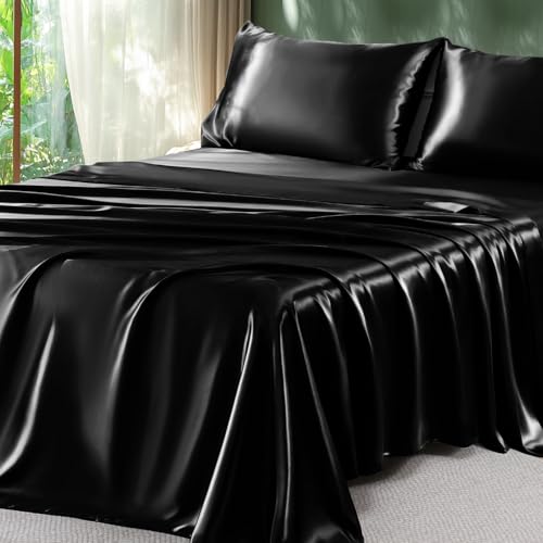 Sasttie Satin Sheets Queen Size – 4 Pieces Luxury Soft Black Silky Bed Sheets Set with Pillowcases – Smooth Silk-Like Satin Fabric, Reinforced 14 Inches Pocket, Oeko-Tex Certified