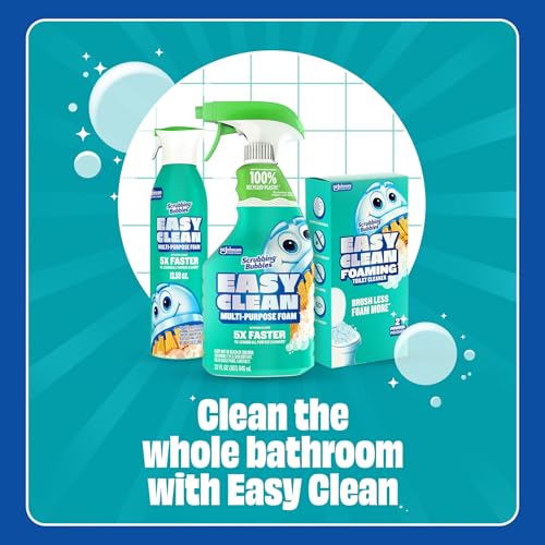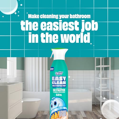 Make cleaning your bathroom the easiest job in the world. The new Scrubbing Bubbles Easy Clean Multi-Purpose Cleaner delivers a powerful foam that cuts through grime and leaves surfaces sparkling. With its continuous spray aerosol can, this Easy Clean foam clings to nooks and crannies and cleans 5X faster*, dissolving stains in seconds. Say goodbye to endless scrubbing and watch tough soap scum and limescale disappear before your eyes. The fresh scent leaves your bathroom smelling amazing, because nobody wants to shower in a chemical factory. Scrubbing Bubbles bathroom cleaner is perfect for all your bathroom surfaces, including showers, sinks, fixtures and toilets. *vs. leading all purpose cleaners on limescale