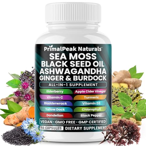 Sea Moss Black Seed Oil Ashwagandha Ginger Burdock Bladderwrack Turmeric & Vitamin C Vitamin D3 with ACV Elderberry Chlorophyll Dandelion Yellow Dock Vegan Capsules – 60 Count