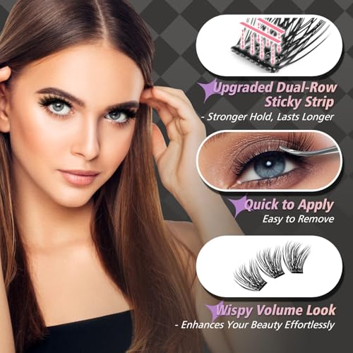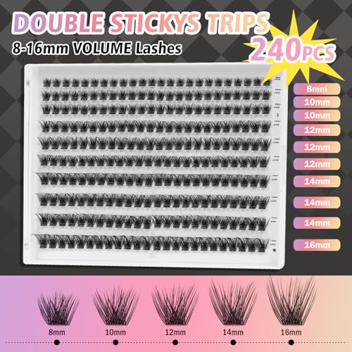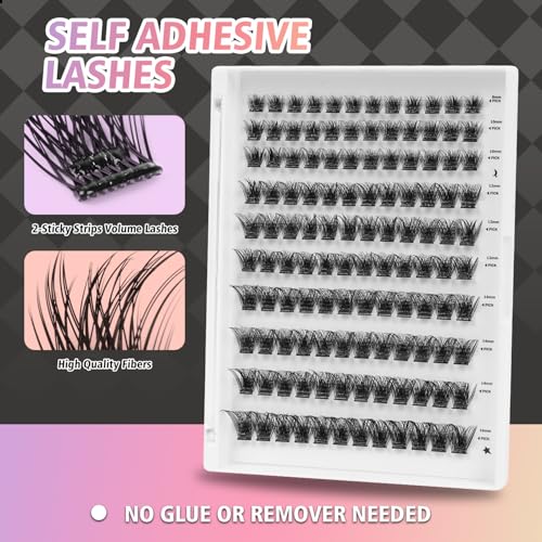 Self Adhesive Eyelashes, 240 Pcs Self Adhesive Eyelash Clusters, No Glue Needed, Invisible 2-Strip Tape – Longer Lasting, No Sticky Residue Pre-Glued Eyelashes (Fluffy-Mixed)