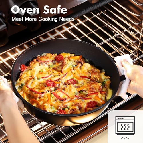 Oven Safe Pots and Pans: Can be used in the oven with the handles easily unscrewed to meet your everyday cooking needs. Oven safe up to 550ºF. Comes with clear tempered glass lid: good sealing performance to lock in moisture, protect from knocks, no noise, no dents.