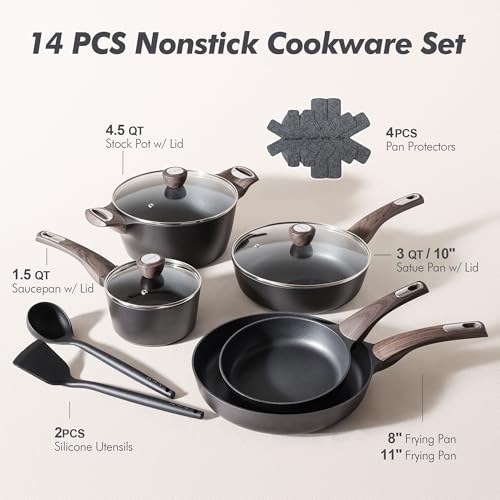 14 Piece Cookware Set Includes – 8 inch & 11 inch frying pan set, 10 inch/3QT saute pan with lid, 4.5QT stock pot with lid, 1.5QT saucepan with lid, 2pcs multi-purpose utensils, 4pcs pot protectors.