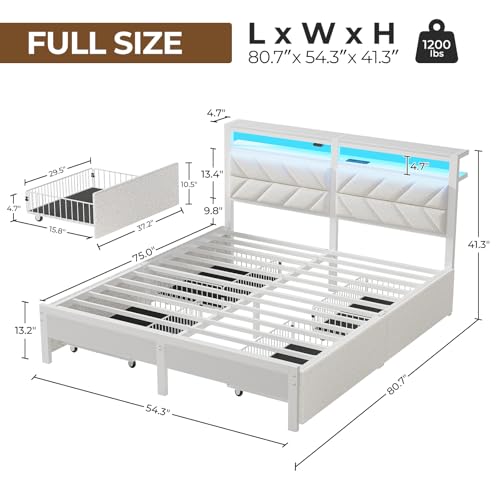 Specification: Seventable Full Size Bed Frame with 4 Storage Drawers, Charging Station & LED Lights, Upholstered Headboard with 2-Tier Shelves, Metal Platform Bed, No Box Spring Needed, Noise-Free, White