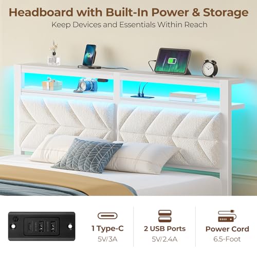 Storage & Charging Headboard: Keep everything you need right by your side. The headboard includes two open shelves for phones, glasses, books, and small décor, plus a built-in charging station with 2 USB ports and 1 Type-C port. Stay organized and keep your devices powered without reaching for wall outlets