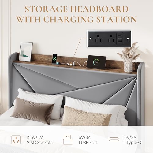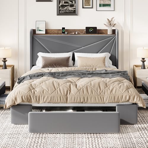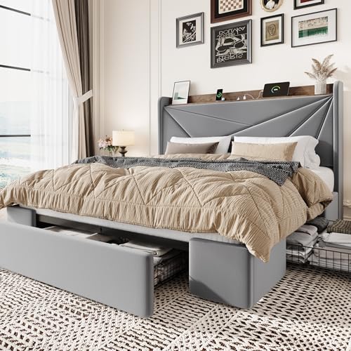 Specification: SHA CERLIN Queen Bed Frame with 3 Drawers, USB & Type-C Charging Ports, Velvet Upholstered Platform Bed with Modern Geometric Wingback Storage Headboard, No Box Spring Needed, Easy Assembly, Grey