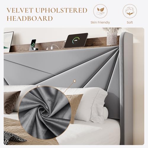 SHA CERLIN Queen Bed Frame with 3 Drawers, USB & Type-C Charging Ports, Velvet Upholstered Platform Bed with Modern Geometric Wingback Storage Headboard, No Box Spring Needed, Easy Assembly, Grey