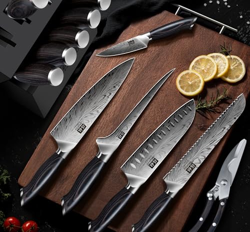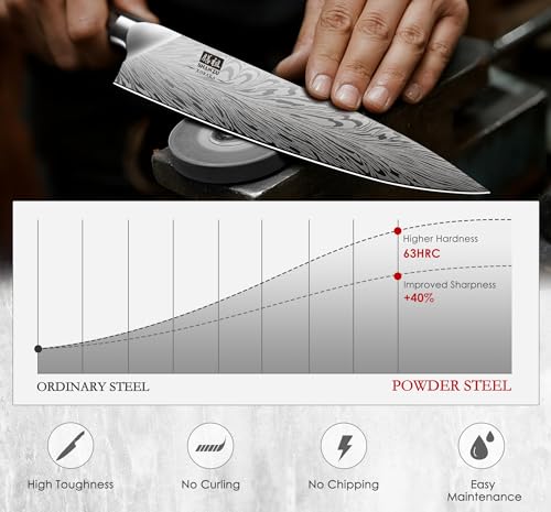 [Fashion Laser Engraved Pattern|NOT DAMASCUS] This professional kitchen knives set features a design that combines traditional aesthetics with modern elements. Engraving a stylish texture pattern on the blade’s surface by laser makes the chef’s knife look more advanced and fashional. NOTE: THIS IS NOT DAMASCUS KITCHEN KNIFE