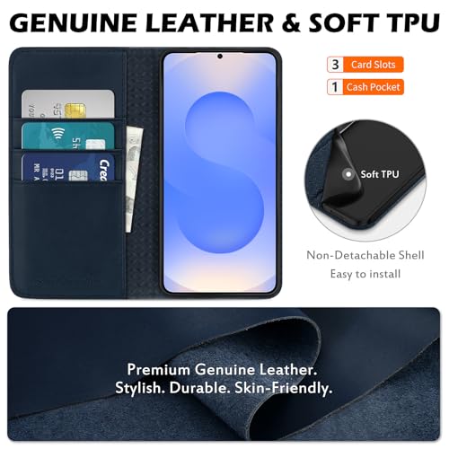 Specification: SHIELDON Case for Galaxy S25 FE 6.7″ 5G, Genuine Leather Folio Wallet Case Magnetic Kickstand RFID Blocking Card Slots Shockproof Protective Cover Compatible with Galaxy S25 FE 2025 – Navy Blue