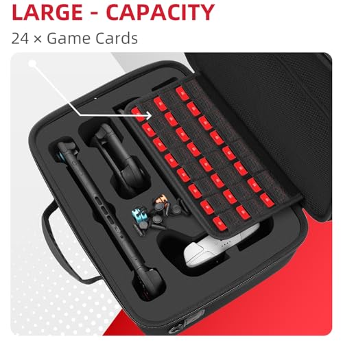 Large Capacity: The all-in-1 carrying case has a strong storage capacity and can accommodate complete nintendo switch system and other accessories. Durable double zipper design, moves smoothly, built-in padded screen protection flap and can store 24 game cards, fully saving space, EVA foam is removable,easy to clean.