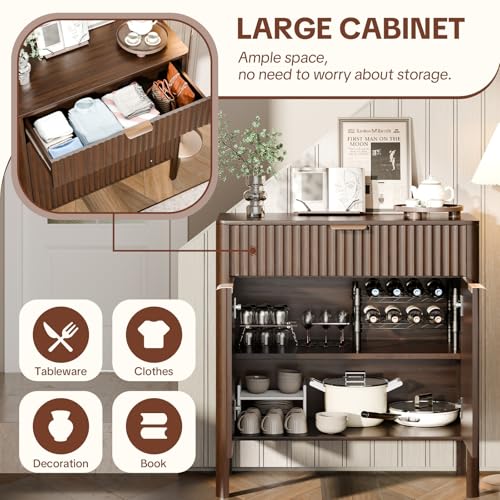 Sideboard Buffet Cabinet with Storage – Modern Fluted Credenza with Doors & Drawer, Accent Cabinet Coffee Table Bar Counter Bookcase for Living Room Kitchen Dining Room Entryway 31″ H Walnut