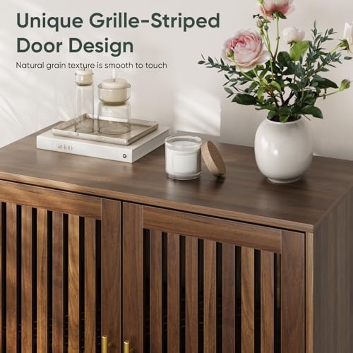 Sideboard Cabinet, 31.5″ W Farmhouse Buffet Cabinet with Slatted Doors & Adjustable Shelf, Wood Coffee Bar Storage Station for Kitchen, Dining Room, Living Room, Entryway, Walnut Color