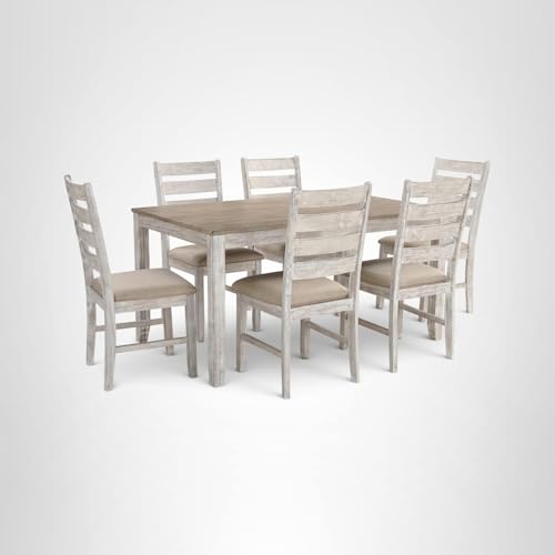 Set the scene for coastal chic or modern farmhouse living with this dining room table set. Clean-lined, simply striking table doubles the charm with a brown tone top with plank effect, paired with a grayish white base with rub through effect for timeworn appeal. Six chairs with classic ladderback styling and comfortably upholstered seats make room for one and all. Whether your home is contemporary or modern, there’s a durable dining table set finish or material that’s perfect for your space. Whatever your specific tastes, we have a dining room set that combines the latest trends with technology to give you the very best for your home. With unmatched prices and quality, we’re your one-stop destination for furniture and home accents and decor, like throw pillows, blankets and more.