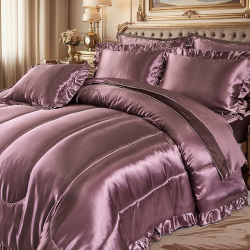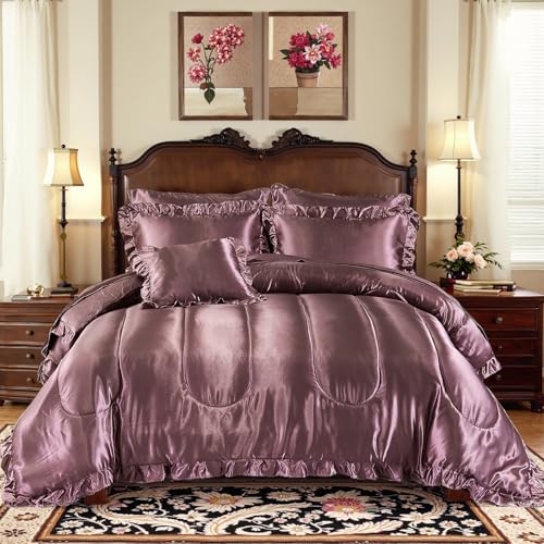 Specification: Silk Like Satin Comforter Set with Sheet Set Full Size 8 Pieces Blush Pink Satin Bedding Set Silky Ruffle Pattern Home Deocr Luxury Silky Comforter Set with 1 Cushion Cover