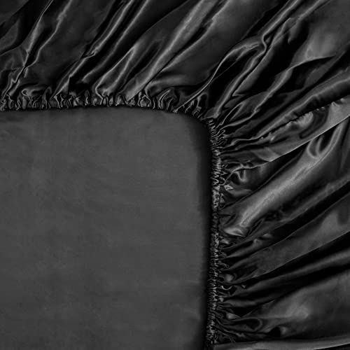 Silk Satin Black Twin Fitted Sheet, Deep Pocket Fitted Sheet Only, Breathable, Non- Fading, Fully Elasticized Bed Sheets Sold Separately