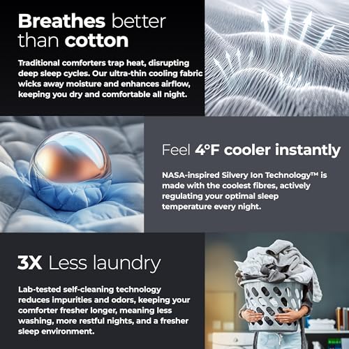 REVOLUTIONARY SELF-CLEANING TECHNOLOGY: Lab-tested to reduce 99.9% of specific impurities, the Silvery Cooling Comforter stays fresh significantly longer than traditional bedding, reducing the need for frequent washing. Dermatologist-recommended for healthier skin and smoother hair.