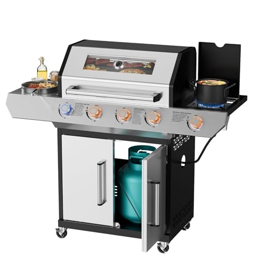 Specification: SKOK 4-Burner Led Gas BBQ Grill with Side Burner & Visual Glass, Barbecue Grill,60,000 BTU Stainless Steel Propane Grill 629 Sq. In. Grilling Area