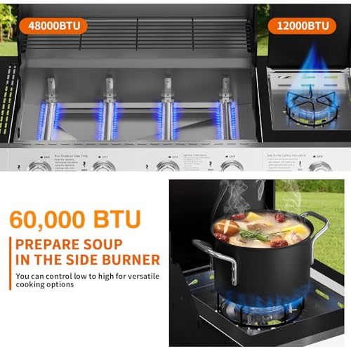 🍖【60000 BTUs Cooking Power】: Boasting 4 stainless steel burners and a side burner, our grill delivers up to 60,000 BTU of cooking power! The battery-powered electronic ignition system allows for quick starts with just a push and turn of the control knob. Perfect for achieving that ideal sizzle every time!