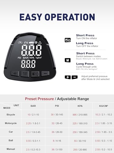 Smart Auto-Stop Technology – Featuring real-time pressure tracking with a built-in digital gauge, this tire inflator automatically shuts off when reaching preset PSI (car/motorcycle/bicycle modes supported). The display updates pressure data every 0.5 seconds, eliminating manual monitoring and preventing over-inflation risks