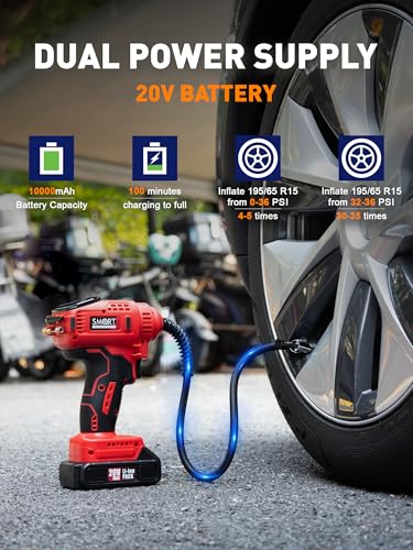Specification: SMART JERRY – Car Tire Inflator Portable Air Compressor | 20V/12V Dual-Power Cordless Air Pump with 150 PSI Max Pressure & Smart Auto-Stop | Fast Inflation for Cars, Motorcycles, Bikes, Sports Balls