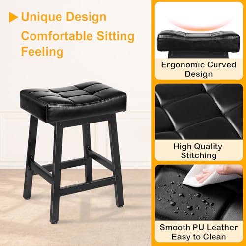 Snughome Bar Stools Set of 2, 24.4 Inch Counter Height Bar Stools for Kitchen Island, 4.1“ Thick Saddle Seats with Curved Surface, Heavy Duty Metal Base, Easy Assembly, for Cafe, Black