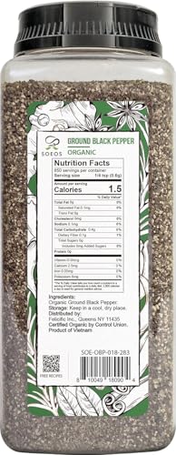 Specification: Soeos Organic Ground Black Pepper, Non-GMO, Freshly Peppercorn Powder Bulk, Packed to Keep Peppers Fresh, Ready to Use Peppercorns for Refill, 18 oz (510g)
