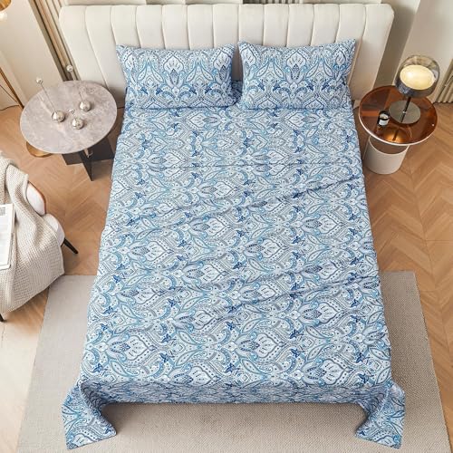 Softan Blue Paisley Printed Queen Size Sheet Set, Blue Floral Sheets Queen, Cozy Microfiber Fitted Sheet with 15″ Deep Pocket & Non-Slip Straps, Flower Patterned Sheets & Pillowcase Sets