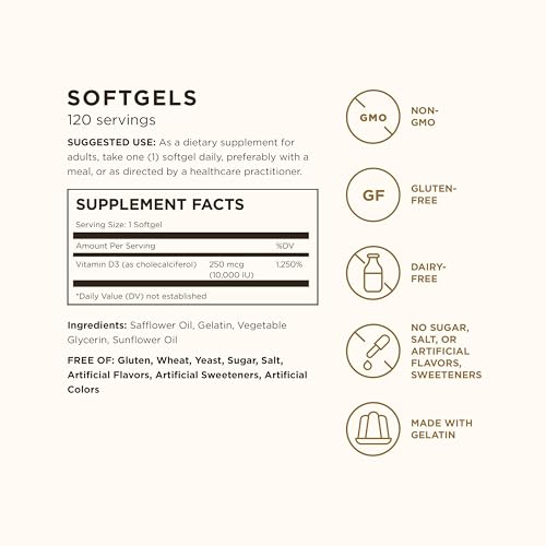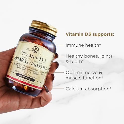 Maintain Healthy Bones And Teeth; Vitamin D is required to promote calcium absorption, which helps maintain healthy bones and teeth; Solgar Vitamin D3 Softgels provide 250 mcg (10,000 IU) in one easy to take softgel