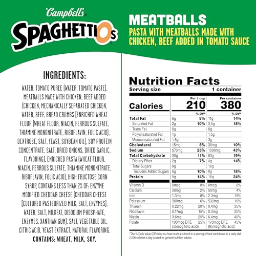 Campbell’s SpaghettiOs with Meatballs is the perfect choice for a great-tasting main dish or filling snack at an affordable price. With no preservatives, this classic has been a family favorite for generations.
