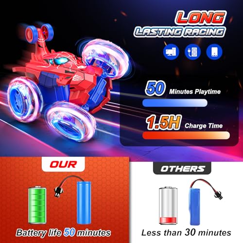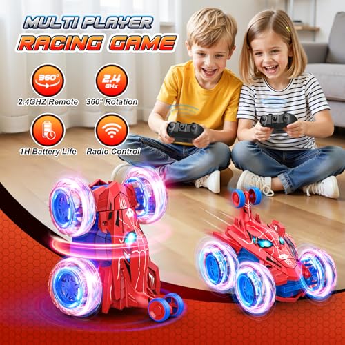 🚘Light Up RC Cars : Our remote control car adopts a unique shape and vibrant colors that easy to attract kids attention, it can make 360 degrees fast rotate and 90 degrees upright driving stunts, also equipped with colorful wheel lights that bring extra thrilling racing experience for your boys,perfect car toys for 3-5 4-6 7 8 year olds boys girls toddlers
