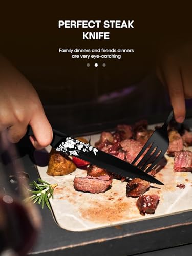 STEAK KNIVES INCLUDED IN THE SET – There are 8 additional steak knives offered in this pack that are also made of stainless steel and decorated with a beautiful laser print of butterflies with flowers. The sharp serrations on the blades allow you to slice through foods easily and are ideal to use for eating. The ergonomic triple riveting handle is strong and durable even when cut hard, and very comfortable to hold.