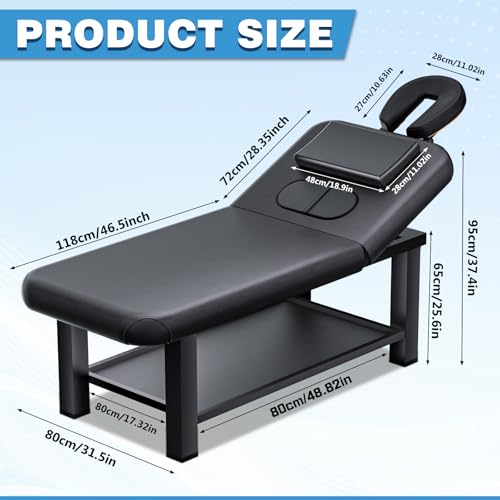 Specification: Stationary Massage Table with Memory Foam, Massage TattooTable with Adjustable Height, Facial Bed for Esthetician, PU Leather, Shelf for Physical Therapy & Spa (Metal, 80”L x 32”W)