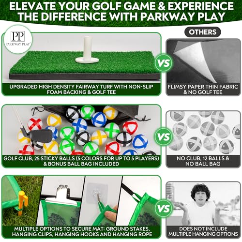 Sticky Golf Chipping Game Set – 6×6 ft Metal Frame Option with Adjustable Clubs, 25 Sticky Balls, Turf Chipping Mat & Scoreboard – Backyard Golf Target Game for All Ages for Indoor/Outdoor Practice