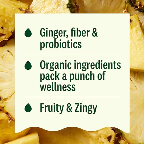 Keep your gut happy and healthy with the Suja Organic Digestion Ginger Pineapple Shot. This gut health-supporting wellness shot is full of plant-based ingredients, like organic ginger, pineapple juice, lemon and acerola cherry. Each ginger shot provides 3g Prebiotic Fiber, 2B CFU of Probiotics and 60% daily value of Vitamin C to help support immunity and digestive health.* Featuring subtle sweet pineapple and a zing of ginger, this digestion supporter gives you a whole lot of wellness in a tiny, tasty shot. Just give the pressed juice shot a shake, drink it in one or two sips, and enjoy the digestive benefits. Take one of these wellness shots any time you need to get your digestion back on track. These Suja Organic juice shots are vegan, gluten free and non-GMO. We make next-level nutrition because if you are going to sip something, you ought to make it count. *As part of a balanced diet and healthy lifestyle.