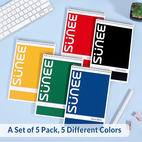 SUNEE Steno Pads 6×9 5 Pack, Gregg Rule, 60 Sheets, White Paper, Take Notes with Top Spiral Notebook, for School, University, College, Work, Office, Classic Color