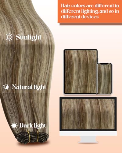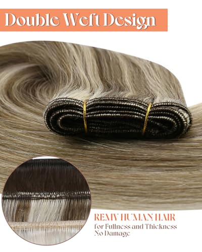 Sunny Hair Sew in Hair Extensions Highlights Human Hair Weft Extensions Light Brown Mix Platinum Blonde Highlights Human Hair Extensions Sew in Bundles Remy Hair 18inch 100g