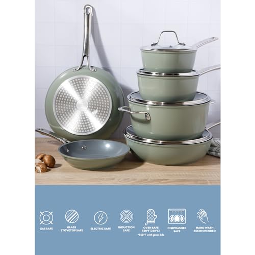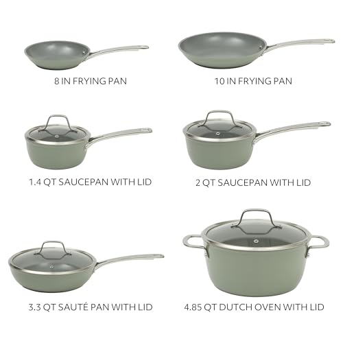 Sur La Table Kitchen Essentials Cool Commune Hard Anodized 10 Piece PFA Free Ceramic Non stick Interior Forged Durable Aluminum Pots and Pans Cookware Set – Green – Induction Compatible